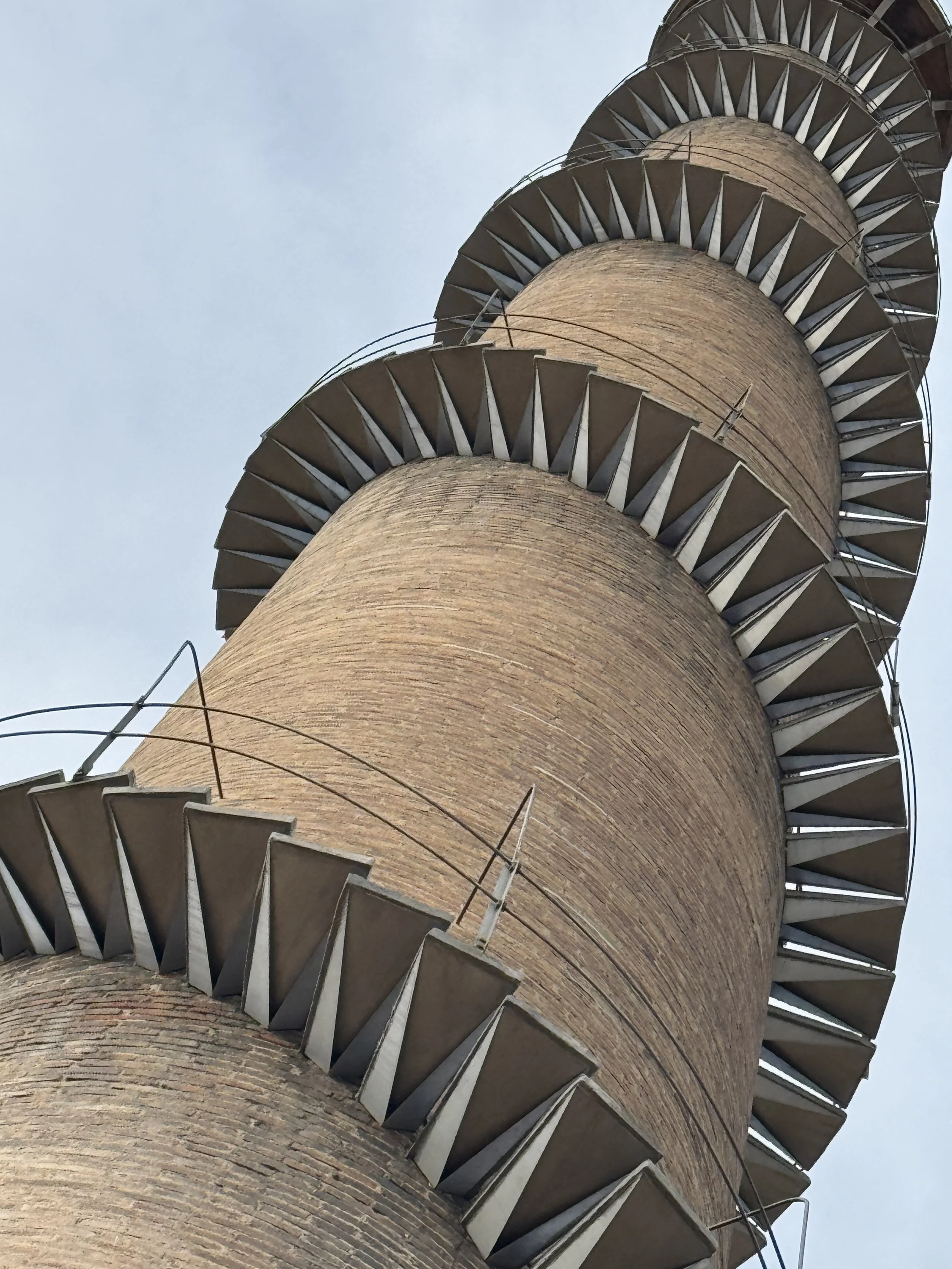 Terrassa is marked with historic chimneys left from the 18th and 19th-century textile era. This one is among the largest, (206 feet). The stairs are unique but you can’t walk up them. These Chimneys have been carefully preserved all over the city as a vital part of its heritage and culture of the textile mills that dotted the city. When we first got here right away we wondered about them and asked about them. We went to a museum here that also had historical information and period pieces. Now as we walk around we enjoy looking for the different chimneys.