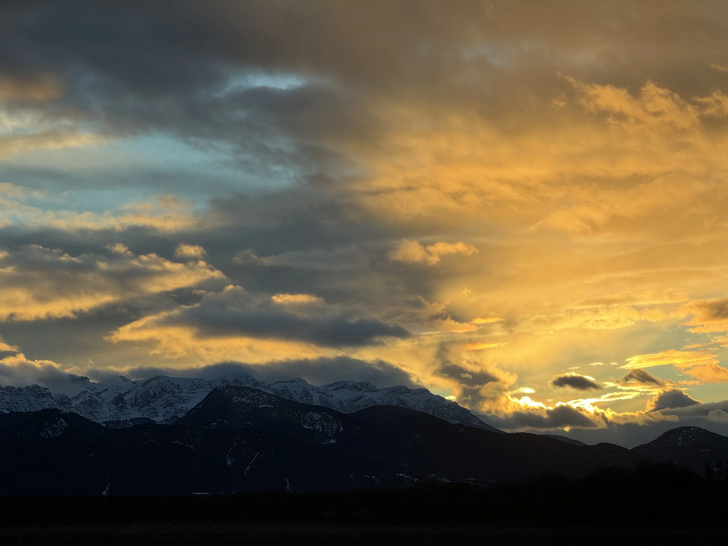 When we emerged from the tunnel, the heavy snow had significantly decreased on the ground and in the air, leaving only light flurries. Winding through the scenic villages below, the landscape showed almost no trace of the immense snow we had just left on the other side of the tunnel. We were going slow, this time due to the speed limit. As we drove up over a ridge we saw this incredible scene of golden light flooding a long skinny valley through the clouds. It was beautiful. A camera could never capture the full scene. We marveled at how the sun, though setting, managed to find that one opening in the clouds to light up the valley out in front of us. We wondered if every sunset in winter was like this for these people.